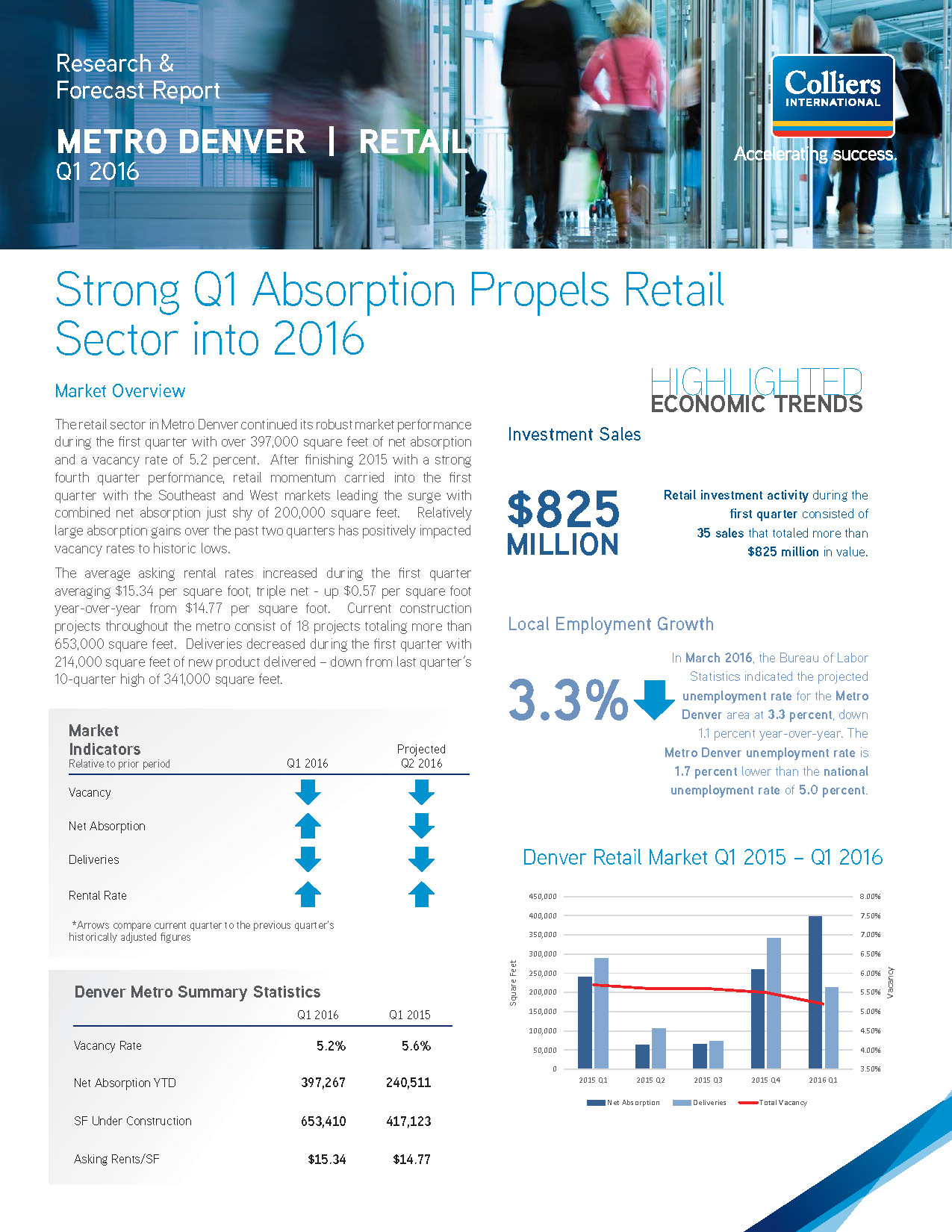 The retail sector in Metro Denver continued its robust market performance during the first quarter with over 397,000 square feet of net absorption and a vacancy rate of 5.2 percent. After finishing 2015 with a strong fourth quarter performance, retail momentum carried into the first quarter with the Southeast and West markets leading the surge with combined net absorption just shy of 200,000 square feet. Relatively large absorption gains over the past two quarters has positively impacted vacancy rates to historic lows.