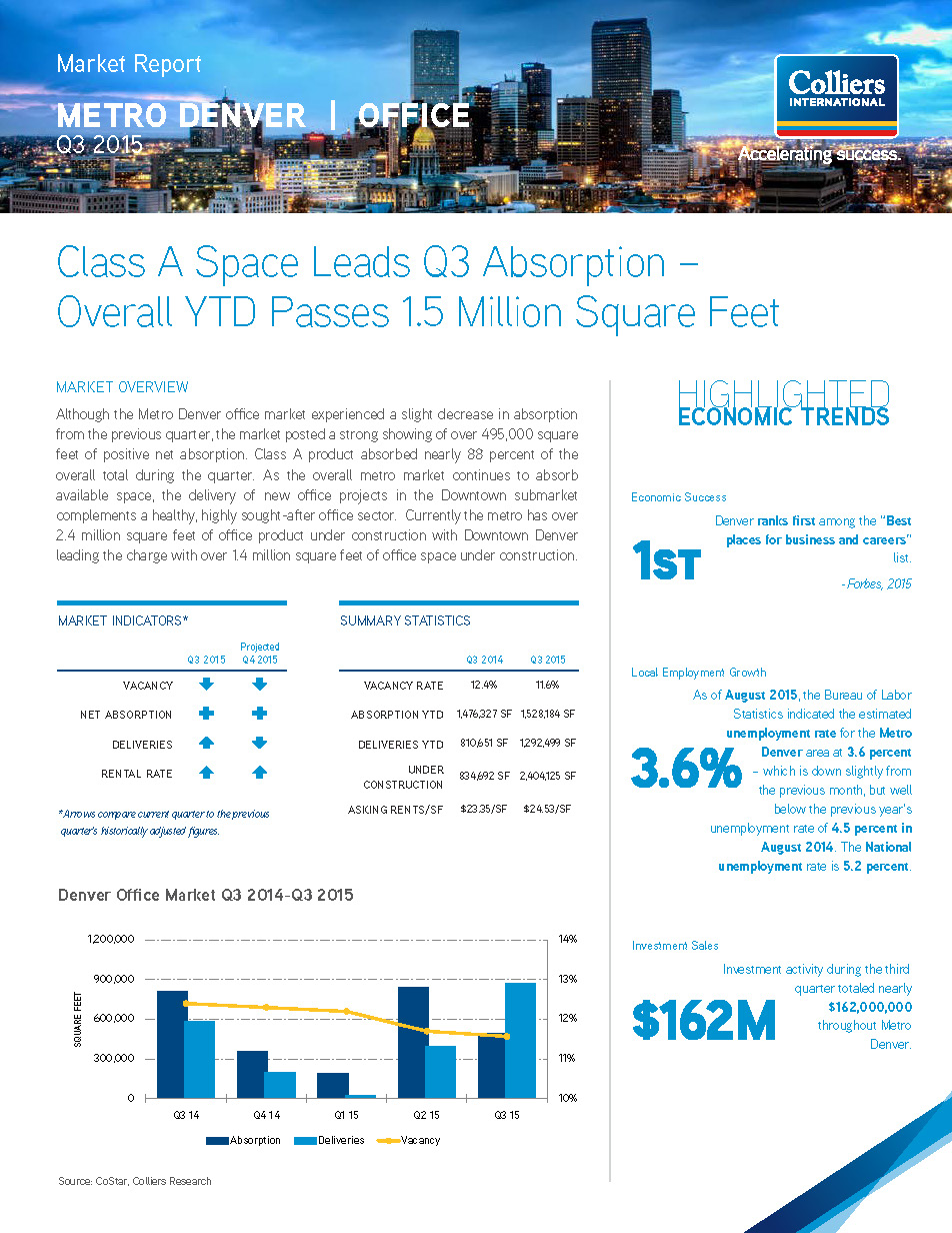 Although the Metro Denver office market experienced a slight decrease in absorption from the previous quarter, the market posted a strong showing of over 495,000 square feet of positive net absorption. Class A product absorbed nearly 88 percent of the overall total during the quarter. As the overall metro market continues to absorb available space, the delivery of new office projects in the Downtown submarket complements a healthy, highly sought-after office sector. Currently the metro has over 2.4 million square feet of office product under construction with Downtown Denver leading the charge with over 1.4 million square feet of office space under construction.
