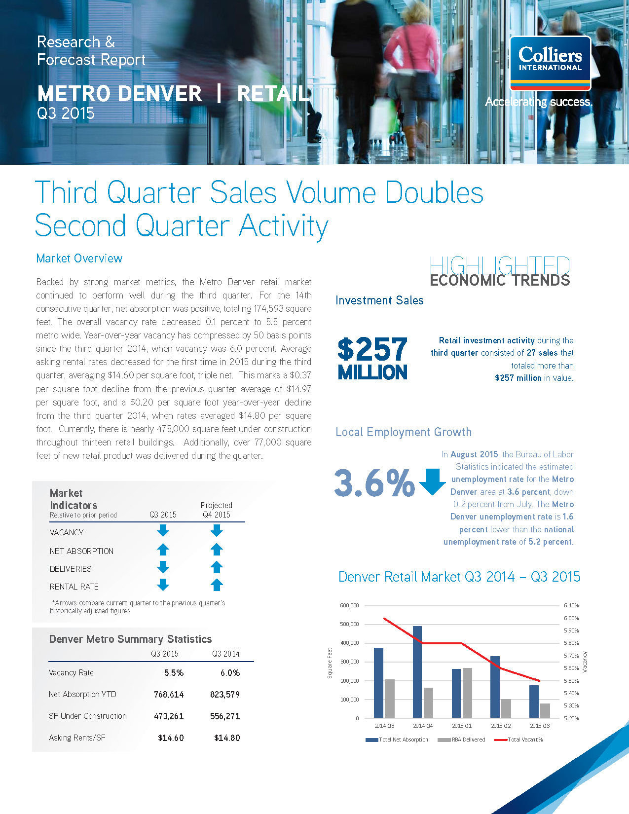 Backed by strong market metrics, the Metro Denver retail market continued to perform well during the third quarter. For the 14th consecutive quarter, net absorption was positive, totaling 174,593 square feet. The overall vacancy rate decreased 0.1 percent to 5.5 percent metro wide. Year-over-year vacancy has compressed by 50 basis points since the third quarter 2014, when vacancy was 6.0 percent. Average asking rental rates decreased for the fi rst time in 2015 during the third quarter, averaging $14.60 per square foot, triple net. This marks a $0.37 per square foot decline from the previous quarter average of $14.97 per square foot, and a $0.20 per square foot year-over-year decline from the third quarter 2014, when rates averaged $14.80 per square foot. Currently, there is nearly 475,000 square feet under construction throughout thirteen retail buildings. Additionally, over 77,000 square feet of new retail product was delivered during the quarter.